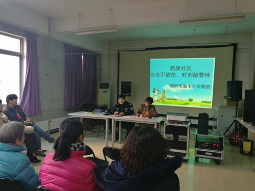 活动中,社区民警将2017年度警情进行了通报,并提醒居民注意防火,防盗。深入讲解了电动车发生火灾的原因及自救措施,提醒大家勿将电动车停放在楼道、楼梯间内;不在室内超长时间为电动车充电;不购买和使用非标和超标电动车;不对电动车加装电池和改装;不使用非原装充电器为电动车充电;不在电动车周边放置易燃品和使用明火等六点提示。居民观看了电瓶车违规充电导致火灾的案例警示教育视频,会后晓康社区为居民发放电动车使用过程中正确充电及日常维护的宣传材料。