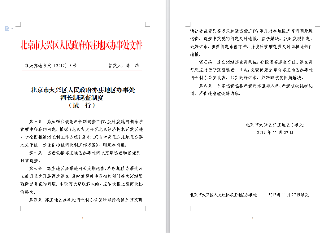 京兴亦地办发[2017]3号河长制巡查制度